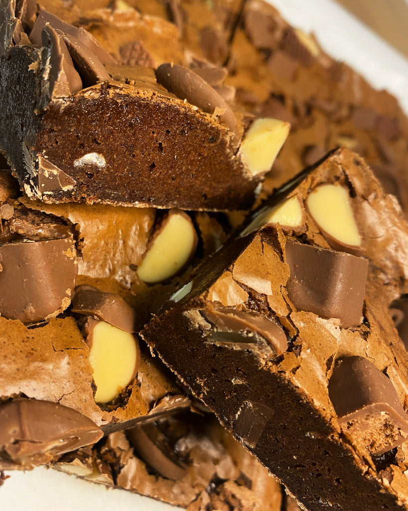 Triple Chocolate Brownie, topped with pieces of Cadbuy fudge, wispa and caramel buttons