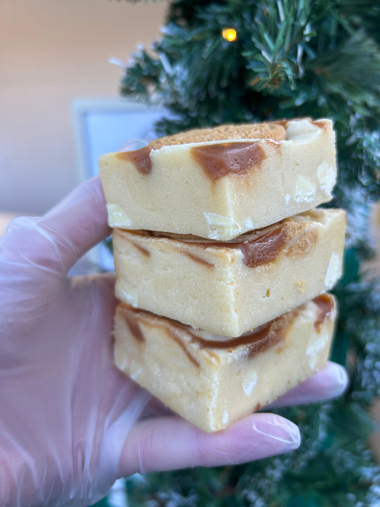 White Chocolate Blondie with caramel sauce, topped with Gingerbread Oreo